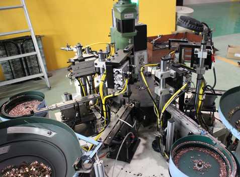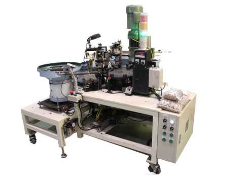 Rotary riveting machine configures vibration plate for automatic feeding.